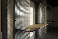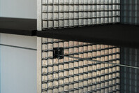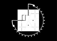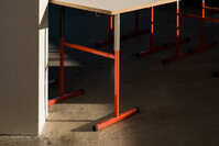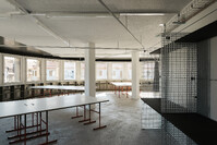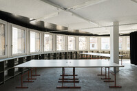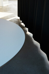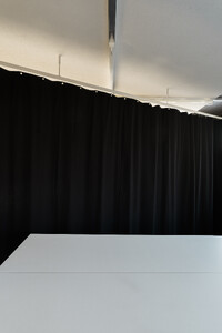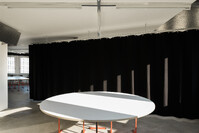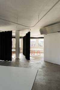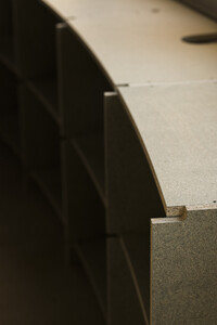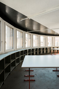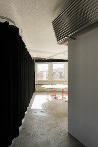 Die kreisrunde Geometrie und die massiven Strukturen des in schwerer Vorfabrikation errichteten Bürohauses an der Hohlstrasse stellen eine Herausforderung für die Performance und die Atmosphäre des dicht genutzten Großraumbüros mit zwölf Arbeitsplätzen dar. Die speziell entwickelten Innenausbauten versuchen nicht, diesen Umstand zu verheimlichen, sondern schöpfen aus ihrer unvermittelten geometrischen Überlagerung Kraft. Vom Textil der Bühnenvorhänge über die fragilen Brüstungsmöbel aus Spanplatten bis hin zum Schwerlastregal aus Gitterrosten folgen alle Elemente des Raumes denselben gestalterischen Prinzipien. Einzelne massgefertigte Bauteile erhöhen die Leistungsfähigkeit der eingesetzten Standardprodukte. Wiederholungen, Fügung und Raster stellen sich der brutalistischen Architektur spielerisch entgegen.