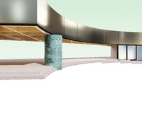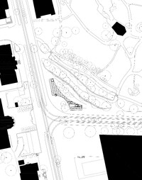 Der Pavillon im Park ist als offener Treffpunkt im Uni-Quartier konzipiert. Er soll allen – den Institutionen, den Anwohnern des Quartiers, den Pendlern und den Besuchern – als Ort für Nutzungen und Begegnungen dienen. Durch seine maximale diagonale Ausdehnung und die raumfassende Wirkung seines Daches vermag sich der Pavillon in verschiedenen Maßstäben mit dem Ort zu verbinden. Seine Form ist ein präzises, kontextuelles Passstück und eine selbstbewusste Form zugleich. Ein leicht verzerrtes, ortsspezifisches Achsraster vermittelt zwischen den um 102° ausgedrehten Strassenfluchten. Die präzisen Schnitte des Daches folgen dabei der inneren Logik seiner geometrischen Eigenständigkeit: Zwischen den beiden Kreisbögen des Vorplatzes und des Parkraums sowie entlang der zurückversetzten Strassenbaulinien findet der Pavillon eine Form, die ihn je nach Perspektive als strassenbegleitendes Dach, als Tor zum Park oder als frei geformte, schatten spendende Gartenhalle erscheinen lässt.