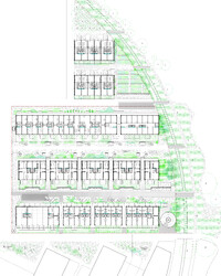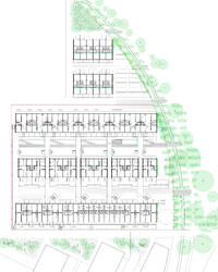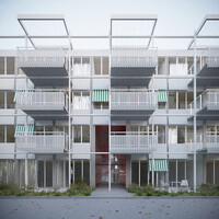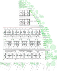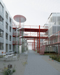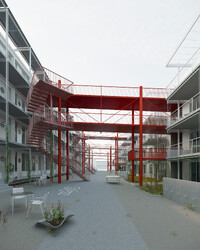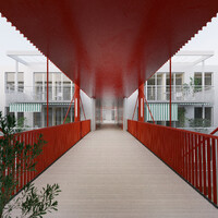 Auf dem Teilbaufeld D des Walkeweg-Areals reihen sich drei Wohnzeilen mit gleichmässigen Abständen auf. Durch die hohe Dichte der Setzung kann der Übergang zum Gleisbogen freigespielt und der für die Gemeinschaft wertvolle Grünraum auf das Grundstück erweitert werden. Die drei Baukörper werden nicht als unabhängige Einheiten verstanden, sondern mit einem um 90 Grad gedrehten Erschliessungssystem zu einem Netz verbunden. Diese sozialräumliche und ortsbauliche Entscheidung strukturiert die Hofräume und bietet grosse typologische und gemeinschaftsbildende Potenziale. Während die unteren Geschosse über Durchgänge und Treppen erreichbar sind, verbinden ab dem zweiten Obergeschoss leichte Brücken die Häuser. Innerhalb eines gleichbleibenden Holzbaurasters werden spezifische Typologien für jede Zeilen und ihre Lagequalitäten entwickelt. So entstehen Nachbarschaften und Begegnungen nicht entlang der «blinden» Längsseite der Häuser, sondern mit dem Gegenüber. Da die Verteilung der Wohnungstypen zeilenweise erfolgt, werden über die gedrehten Erschliessungen nicht die immergleichen Wohnungen verbunden, sondern eine konsequente Durchmischung gefördert.