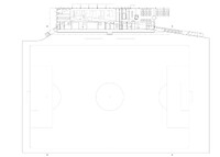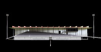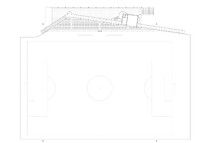 Die unter dem Dach hängende Kabine markiert den Tribünen-Hauptaufgang und die darunter liegende Aussenwirtschaft. In der Kabine finden der Stadionsprecher sowie ein flexibler Mehrzweckraum Platz. Die Zugangskontrolle zu den Rängen erfolgt ganz einfach am Beginn der Rampen- resp. Treppenaufgängen. Der rückwärtige Bereich zwischen Stadion und Sporthalle bleibt öffentlich und macht das Erdgeschoss des Neubaus auch von aussen erreichbar.