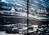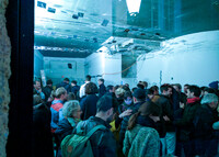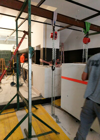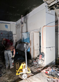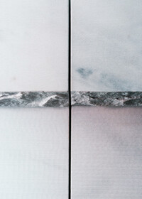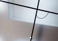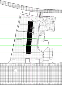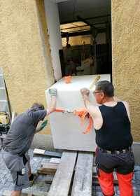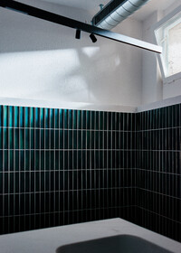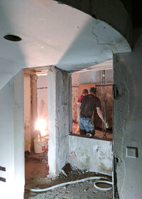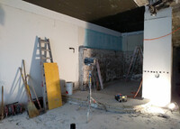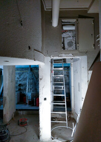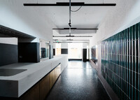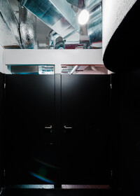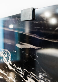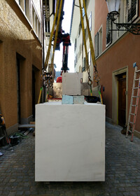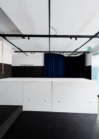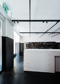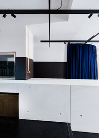 Die aus mehreren Umbauten resultierende Geometrie des Raumes wird mittels maximal kontrastreichem Schwarz-Weiss-Horizont aufgelöst. Der neue Raum wird durch collageartige Materialfelder neu definiert. Sie folgen als unabhängige Importe ihrer eigenen Logik: Stoff hängt, Keramik klebt, Steinplatten werden mit Bolzen gehalten,.. In der Mitte des Raumes steht die Bar aus massivem Marmor: Fünf Blöcke und insgesamt 19 Tonnen Laaser Marmor. Die nahezu unbearbeiteten Steine weisen Transport- und Ge- brauchsspuren auf und stehen direkt auf dem Boden. Lochbohrungen zeugen von der Technik des Transports und eine einfache, ausgebrochene Kante deutet die Nutzung als Bar an. Es gibt kein hinter und kein vor der Bar, es gibt nur den Raum und die Blöcke. Die schiere Masse dominiert den Raum und definiert ein neues, bisher inexistentes Zentrum.